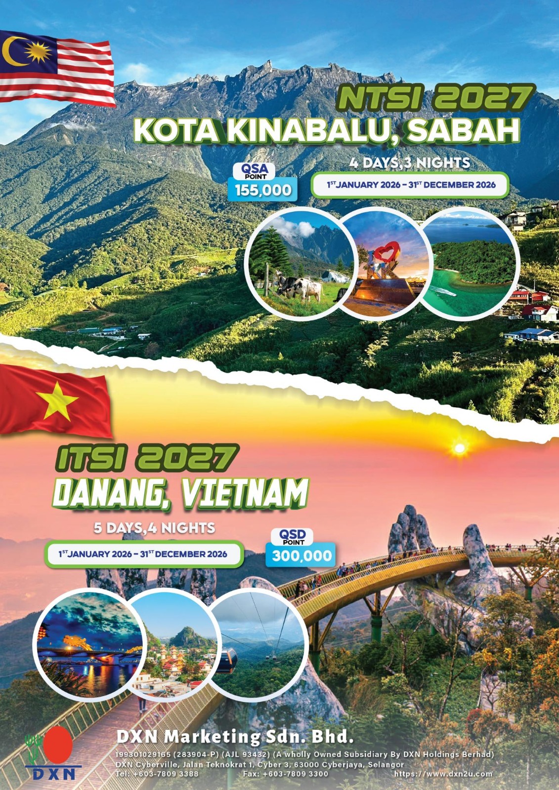 Good Morning DXN! 🌍 DXN Incentive Trip 2027 ✨ Option 1: NTSI 2027 📍 Kota Kinabalu, Sabah 🗓️ 4 Days 3 Nights 📅 Qualification Period: 1 Jan 2026 – 31 Dec 2026 🎯 Required: 155,000 QSA Points ✨ Option 2: ITSI 2027 📍 Da Nang, Vietnam 🗓️ 5 Days 4 Nights 📅 Qualification Period: 1 Jan 2026 – 31 Dec 2026 🎯 Required: 300,000 QSD Points 📌 Organised by DXN Marketing Sdn. Bhd. Start planning and qualify now! 💪✈️ Thank You.