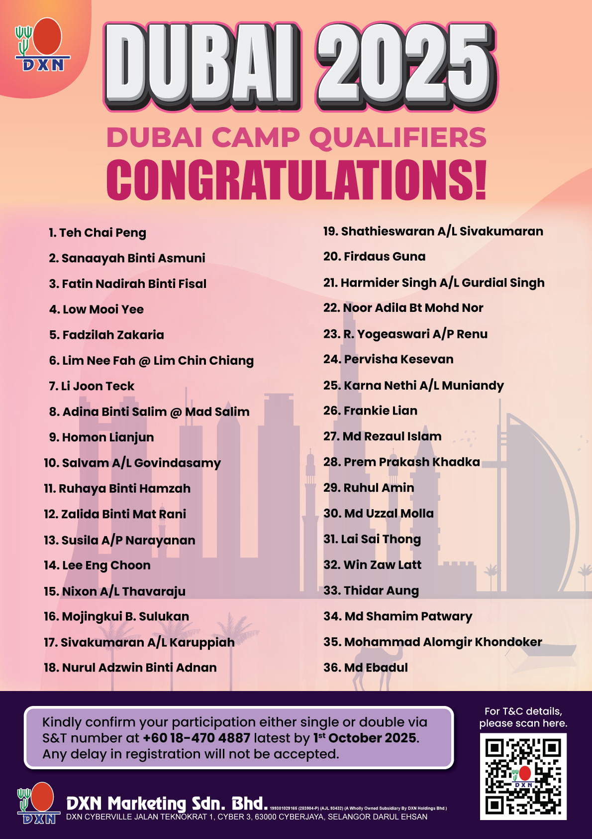 We are thrilled to announce our DXN Dubai 2025 Camp Qualifiers!