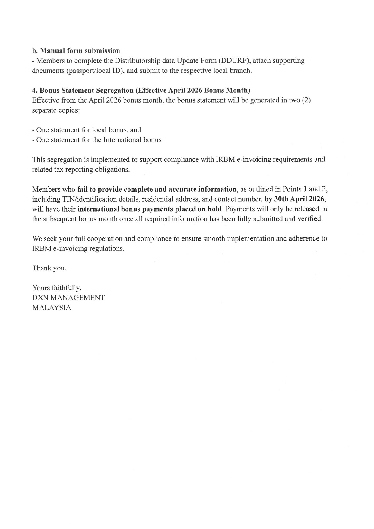 REMINDER: DXN will take stern actions against the foreign membership code and the member who assisted with the purchase on behalf, including but not limited to suspension or termination of membership, if the information provided to the company is found to be incorrect/untrue.