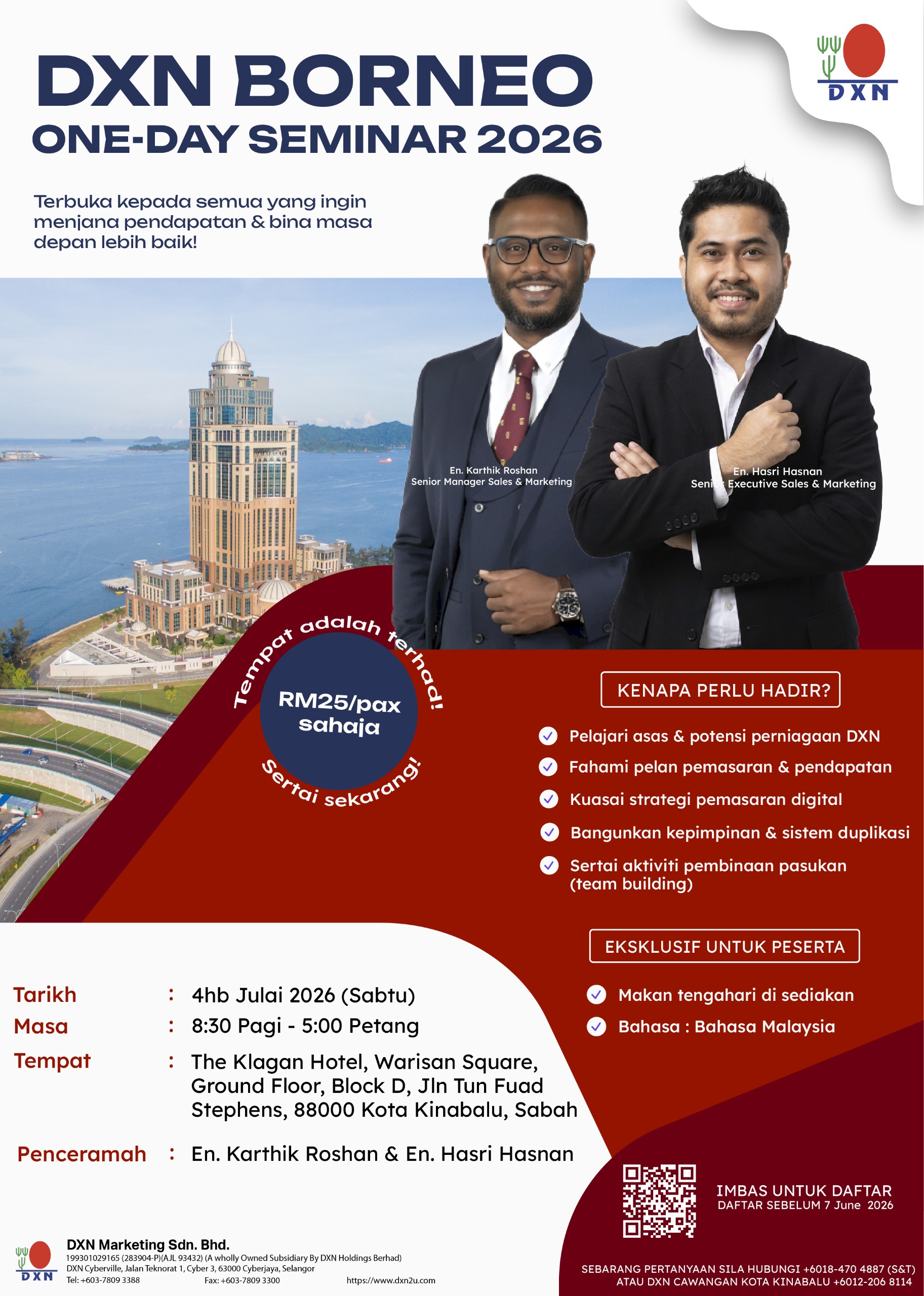 Good Morning DXN! 📢 DXN 33rd Anniversary & Farm Visitation 🗓 Campaign Period: 1 April – 30 June 2026 ✈ Travel Date: 13 Sept 2026 – Anniversary & Recognition 14–16 Sept 2026 – Farm & Factory Visit 📍 4 Days 3 Nights ✅ Qualified Member • 1 Pax: 500 PPV/month (3 months) OR 1,500 PPV • 2 Pax: 1,000 PPV/month (3 months) OR 3,000 PPV ⚡ Partial Qualification • 1 Pax: 300 PPV/month OR 900 PPV + RM350 • 2 Pax: 600 PPV/month OR 1,800 PPV + RM700 💰 Self Pay: RM807 🎁 Package Includes: ✔ Anniversary Ticket ✔ Farm, Factory & Ipoh Tour ✔ Transport ✔ Hotel (4D3N + Breakfast Only) ❌ Excludes: Flight, airport transfer & other meals 📌 Registration: DXN Kota Kinabalu / Kuching 🗓 Before 10 July 2026 (East Malaysia Only) Thank You.